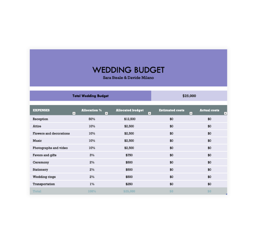 - Replace the default budget value with your total planned wedding budget.